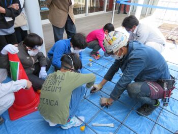 建設の仕事とは?W造・S造・RC造とは?コンクリートとは?鉄筋とは?といった内容について、わかりやすく解説するとともに、コンクリート練り作業、鉄筋の配筋作業を体験してもらい、最後に参加者全員にモルタルを使った手形を作成してもらいました。